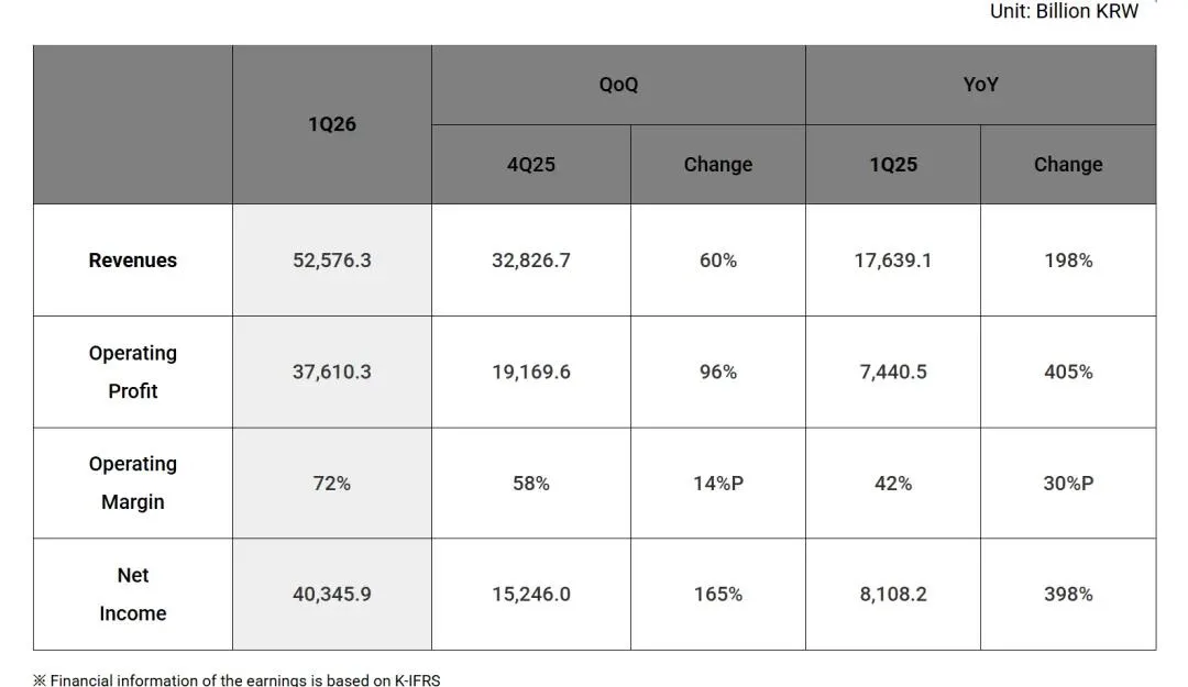 本季度SK海力士业绩爆发式增长,营收达52.58万亿韩元,同比增长198%、环比增长60%,成为韩国首家单季营收破50万亿韩元的芯片企业;营业利润37.61万亿韩元,同比激增405%,营业利润率72%;净利润40.345万亿韩元,同比增长398%,净利率77%,远超市场预期。