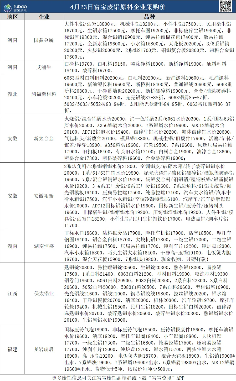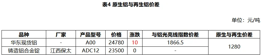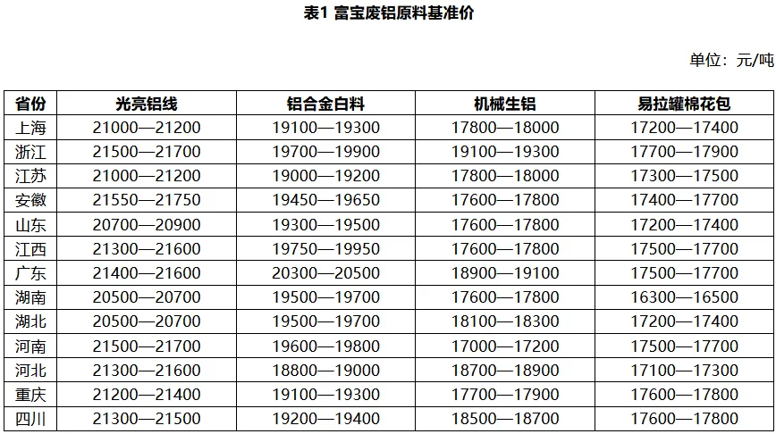 今各地区废铝价格稳中小涨,华东地区光亮铝线20600-21750元/吨,铝合金料18800-19900元/吨;市场报价存在地区差异性,熟铝报价坚-挺,部分品种价格上调;多数下游再生铝企业表示订单不佳,按需补库为主,短期铝价窄幅震荡,料废铝价趋稳。