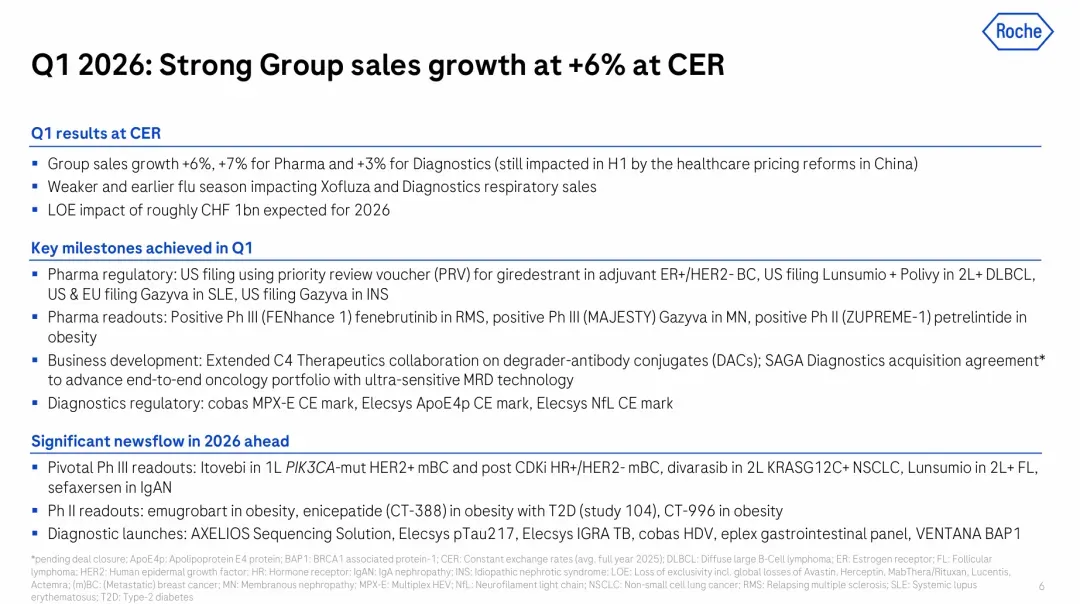 4月23日,罗氏发布2026Q1财报,一季度总营收147.22亿瑞士法郎(约187.63亿美元),同比增长6%。其中,制药业务一季度收入114.69亿瑞士法郎(约146.17亿美元,+7%),诊断业务收入32.53亿瑞士法郎(约41.46亿美元,+3%)。在中国区,其制药业务收入同比增长14%,诊断业务收入同比下降14%。