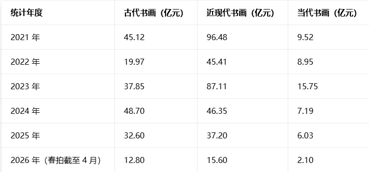 数据来源:中国拍卖行业协会(CAA)年度统计年报、雅昌艺术市场监测中心(AMMA)年度报告,统计口径为全国文物艺术品拍卖市场落槌成交额(不含买方佣金),2026 年仅统计截至 4 月春拍已披露数据2022 年受市场环境影响,三大板块成交额均出现显著回调;2023 年市场全面复苏,近现代书画领涨;2024 年起市场结构性分化加剧,古代书画凭借稀缺性首次超越近现代书画成为第一大板块,该格局延续至 2026 年春拍。一、2026 年书画市场全景调查:分化与复苏并行的新生态
