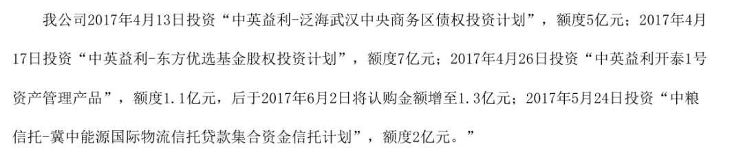 但同时,非标资产从52.40亿翻倍至104.78亿,五个新项目集中在2017年上半年落地:泛海武汉商务区5亿、东方优选股权基金7亿、中英益利开泰1号1.3亿、中粮信托冀中能源2亿……