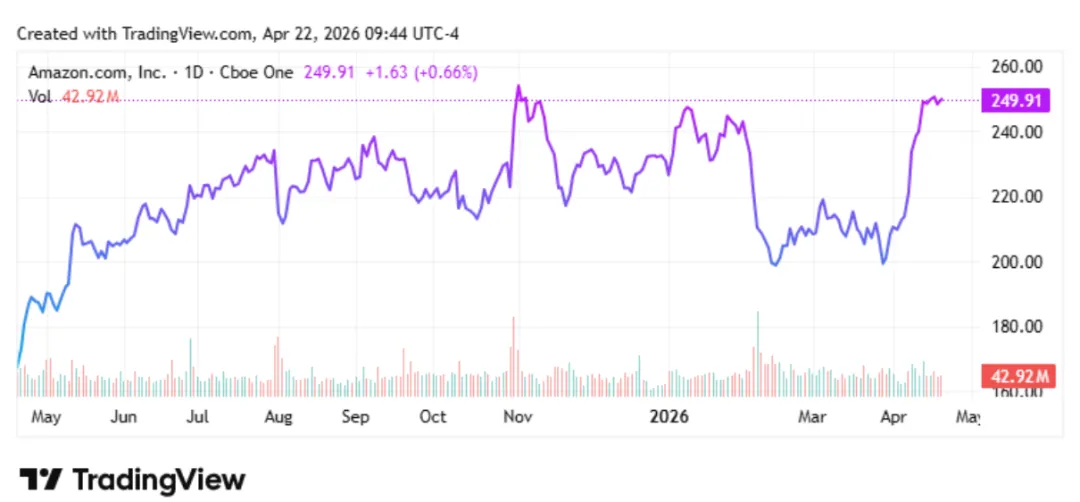 科技巨头亚马逊股价目前稳在250美元附近,短短几周内累计涨幅已接近 30%,距离历史高点仅一步之遥。这是该股近一年来最强劲的一波上涨行情,也彻底扭转了今年年初以来的低迷走势。