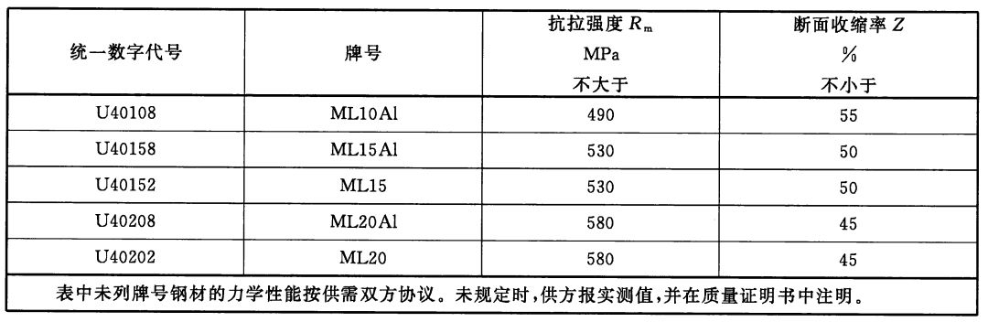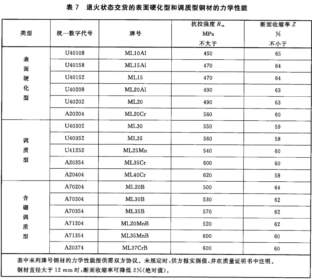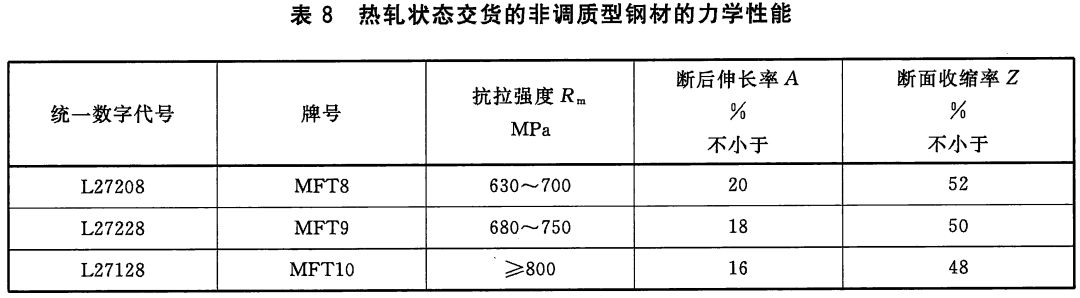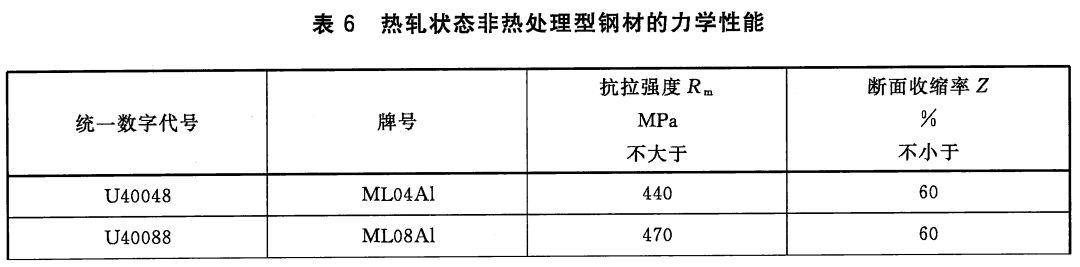 2)非调质型冷镦和冷挤压用钢,热轧状态交货非调质型钢材的力学性能应符合以下表格规定。