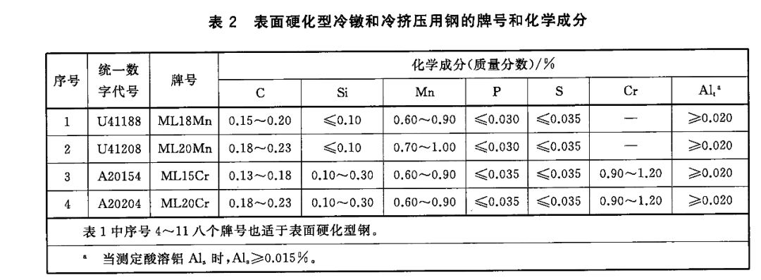 2)表面硬化型冷镦和冷挤压用钢的牌号和化学成分(熔炼分析)应符合以下表格的规定。