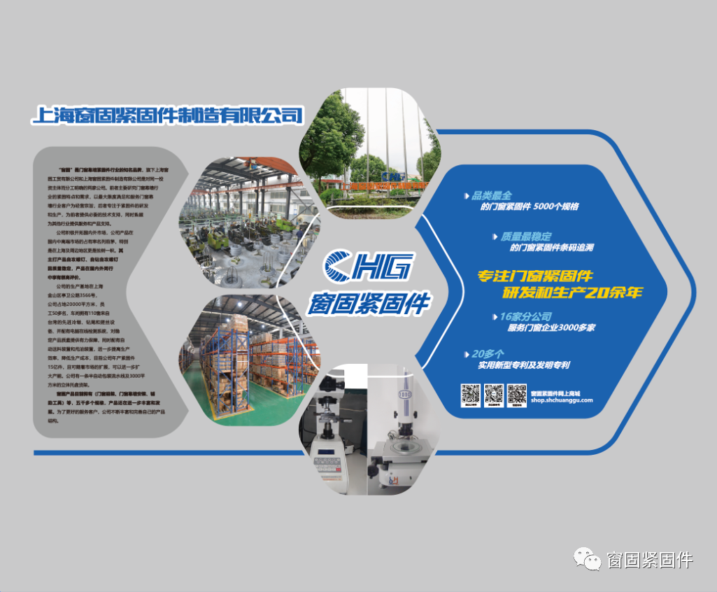 企业简介 Company Information “窗固”是门窗幕墙紧固件行业的知名品牌,旗下 上海窗固工贸有限公司和 上海窗固紧固件制造有限公司是对同一投资主体而分工明确的两家公司。前者主要研究门窗幕墙行业的紧固特点和需求,以最大限度满足和服务门窗幕墙行业客户为经营宗旨;后者专注于紧固件的研发和生产,为前者提供必要的技术支持,同时兼顾为其他行业提供服务和产品支持。 公司积极开拓国内外市场,公司产品在国内中高端市场的占有率名列前茅,特别是在上海及周边地区更是独树一帜。其主打产品自攻螺钉、自钻自攻螺钉因质量稳定,产品在国内外同行中享有很高评价。 公司的生产基地在上海市金山区亭卫公路3566号,公司建筑面积20000平方米,员工40多名,车间拥有110套来自台湾的先进冷墩、钻尾和搓丝设备、并配有电脑在线检测系统,对稳定产品质量提供有力保障,同时配有自动送料装置和甩油装置,进一步提高生产效率,降低生产成本,目前公司年产紧固件15亿件,且可随着市场的扩展,可以进一步扩大产能。公司有一条半自动包装流水线及3000平方米的立体托盘货架。