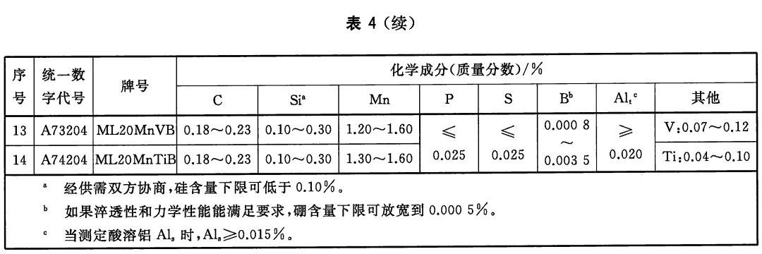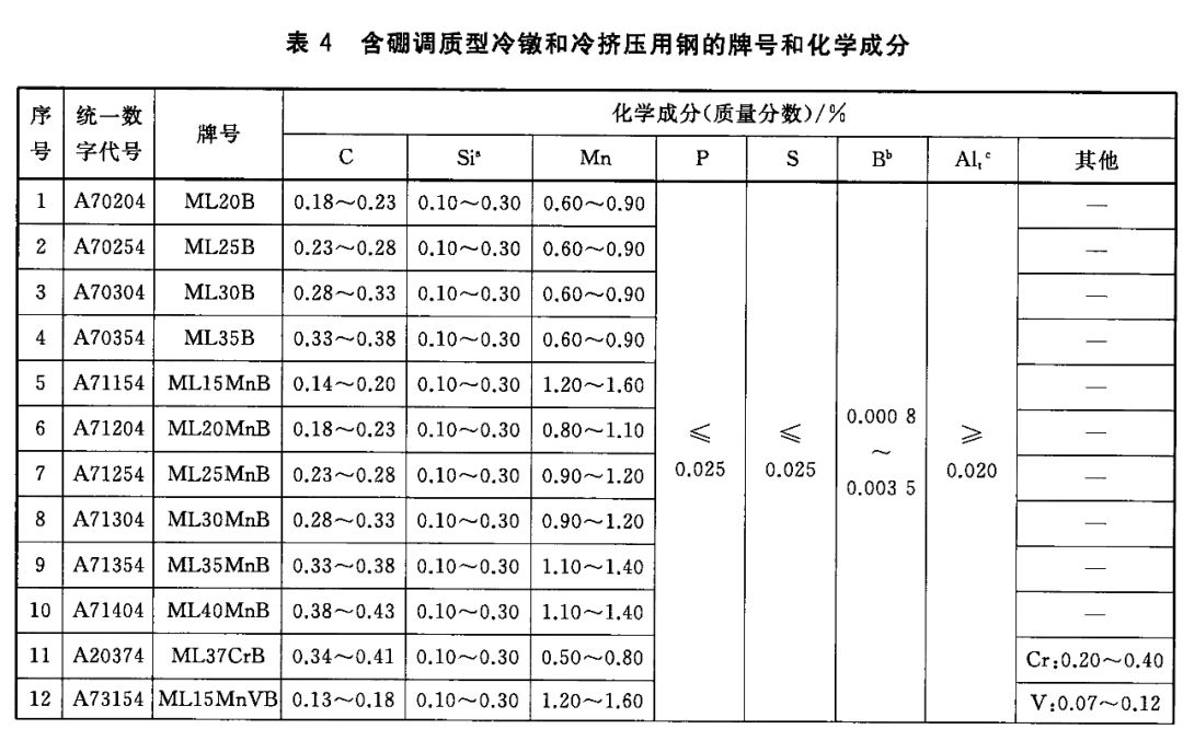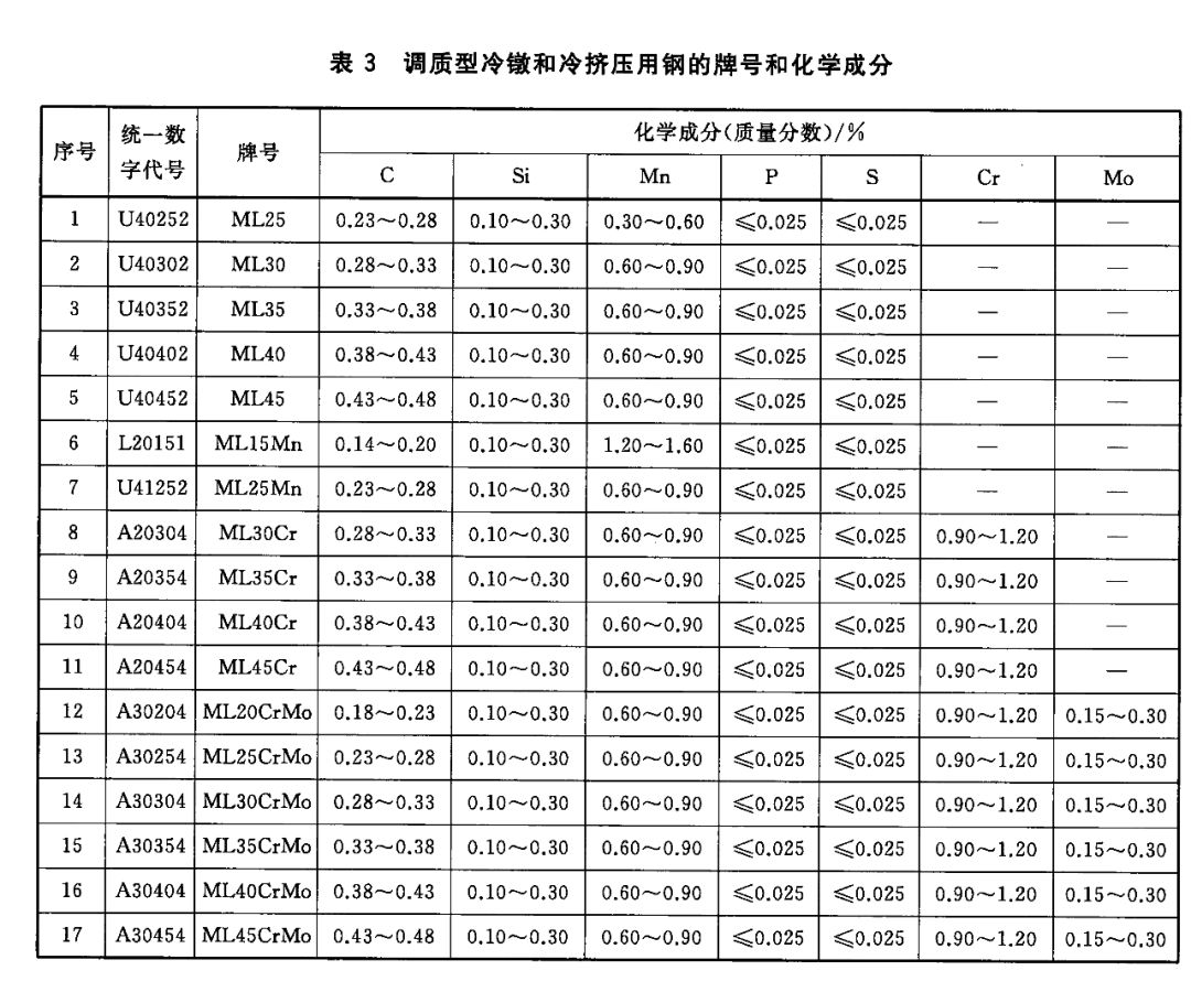 3)调质型冷镦和冷挤压用钢(包括含硼钢)的牌号和化学成分(熔炼分析)应符合表3和表4的规定。