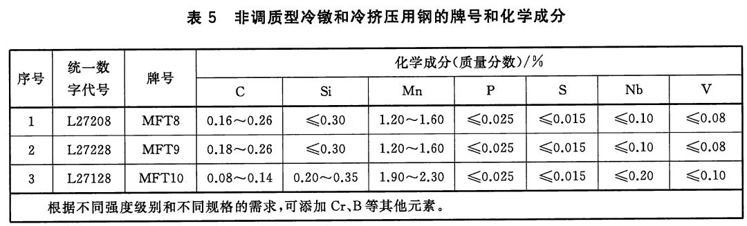 4)非调质型冷镦和冷挤压运用钢的牌号和化学成分(熔炼分析)应符合表5的规定。