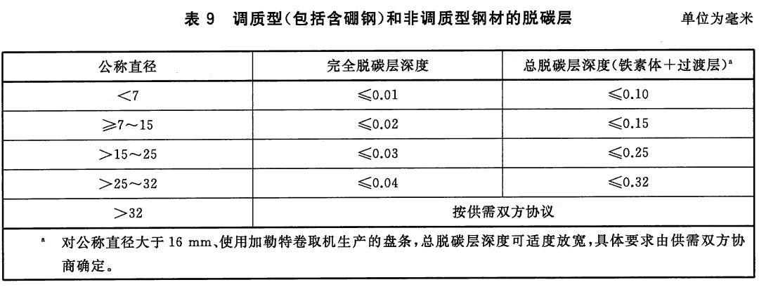 3)调质型(包括含硼钢)和非调质型钢材应进行脱碳层检验。脱碳深度应符合下表规定要求。