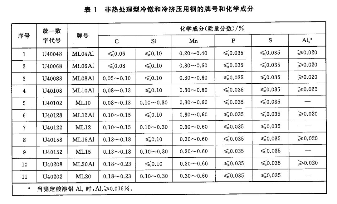 1)非热处理型冷镦和冷挤压用钢的牌号和化学成分(熔炼分析)应符合表中的规定。