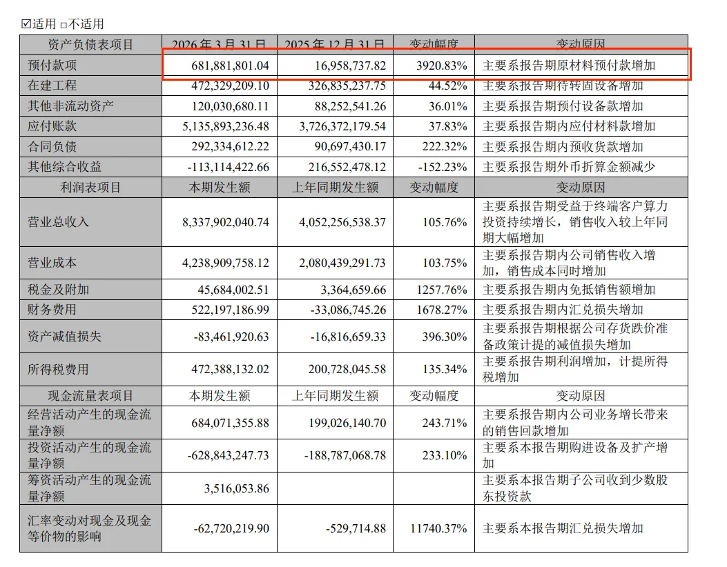 我们可以从预付款项里看到环比增长3920%,物料备货非常积极,其中一部分是预定之前公告的鸿辰光子。