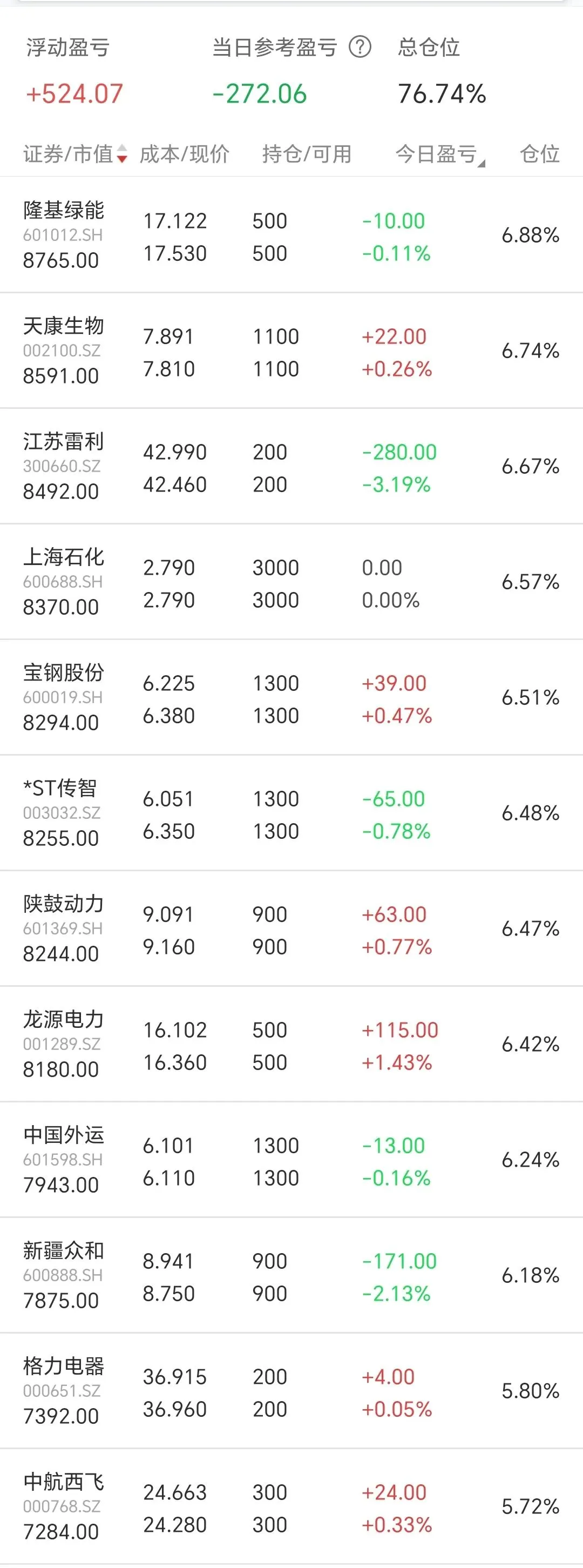 红色表示浮盈持有中