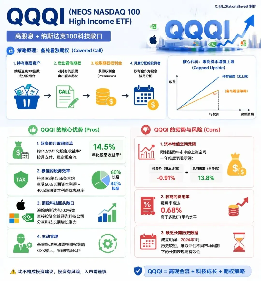 QQQI股息还是很高的,年化差不多14.5%的月度高股息,能带来可观被动收入;其次还符合IRS第1256条合约,享受优惠税率。