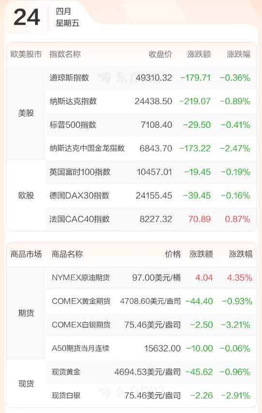 美股三大指数集体收跌,科技股普跌。纳斯达克金龙:-2.47%|富时A50期货:-0.06%,今天大A承压