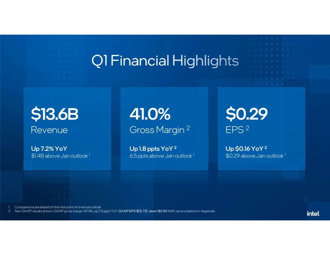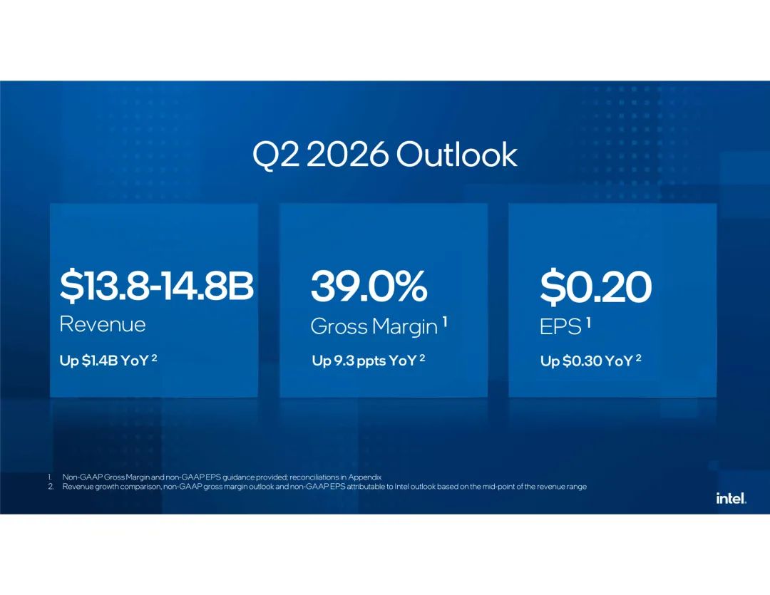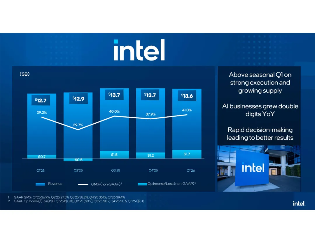 英特尔 2026 年一季报交出新任 CEO 陈立武上任后第一份真正兑现的成绩单:非 GAAP 营收 136 亿美元、同比 7.2%,比自家指引中值高 14 亿;毛利率 41.0%,超指引 6.5 个百分点;EPS 0.29 美元同比翻倍,连续第 6 季度超出指引上限。CCG 靠 Core Series 3 把 Intel 18A 第一次推到主流笔电,DCAI 同比 22%、定制 ASIC 接近翻倍,Intel Foundry 亏损率从 55.7% 收窄到 45.0%。盘后股价上涨反映的是"新英特尔"叙事修复,而不是对利润本身的重估。