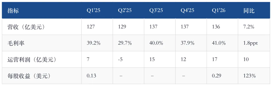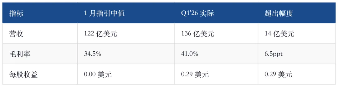 Q2'26 指引(非 GAAP): 营收 138-148 亿美元(中值 143 亿,同比 Q2'25 的 129 亿约 10.9%)、毛利率 39.0%(同比 9.3ppt)、每股收益 0.20 美元(Q2'25 非 GAAP 口径见附表,整体是同比由亏转盈)。GAAP 口径:毛利率 37.5%、每股收益 0.08 美元。
