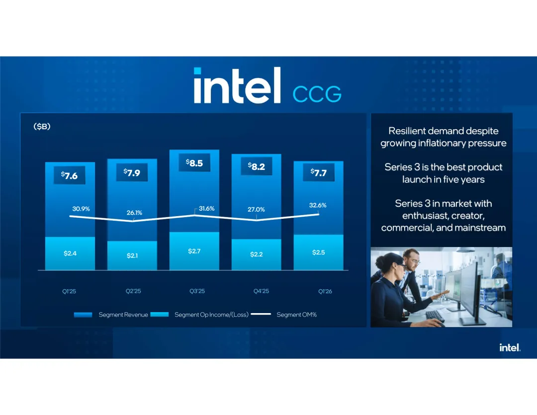 看这张表能看到一件有意思的事:CCG 的运营利润率从 Q4'25 的 27.0% 回升到 Q1'26 的 32.6%,是 5 个季度以来的最高点。这说明英特尔在 Series 3 系列(含主流 Core Series 3 和商用 Core Ultra Series 3)发布时选择了保价格、不靠降价换市场份额的策略。