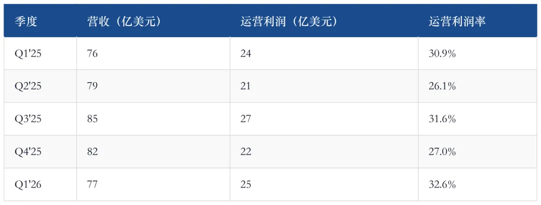 存货拐点: 存货(含原材料、在制品、成品)从 Q4'25 末 116.18 亿美元升到 Q1'26 末 124.26 亿美元,增加 8.08 亿美元。其中在制品(Work in process)从 78.40 亿美元涨到 90.04 亿美元,是存货上升的主力。这对代工业务来说是一个正面信号——在制品上升往往意味着工厂产能利用率在提升、未来 1-2 季收入将跟上。