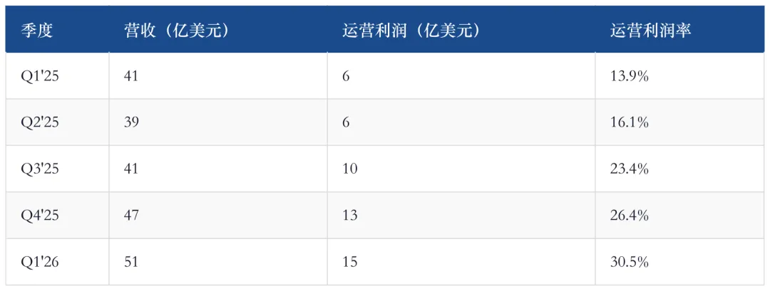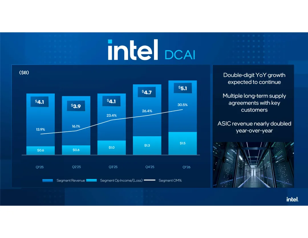 数据中心与 AI 分部(Data Center and AI,DCAI)本季营收 51 亿美元,同比 22%,是所有分部里增速最高的。更关键的是运营利润率从 Q1'25 的 13.9% 一路爬到 Q1'26 的 30.5%,5 个季度涨了 16.6 个百分点。