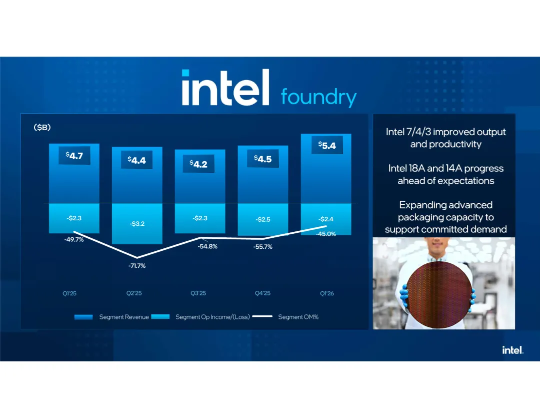 代工分部(Intel Foundry)Q1'26 营收 54 亿美元,同比 16%,运营亏损 24 亿美元。这个亏损数字绝对值并不小,关键看的是它的改善速度。