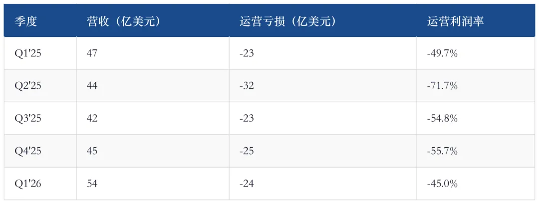 一季亏损率从 Q2'25 的 -71.7% 收窄到 Q1'26 的 -45.0%,改善 26.7 个百分点。更关键的是这 26.7 个百分点里,约 10.7 个百分点来自本季——这季度的改善速度在加快。