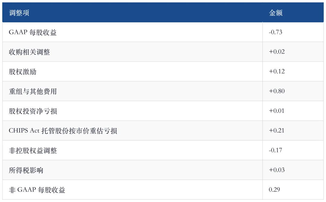 GAAP 口径对照: Q1'26 GAAP 毛利率 39.4%、运营亏损 31.4 亿美元、每股亏损 0.73 美元。非 GAAP 与 GAAP 之间最大的一笔差异是 40.7 亿美元的重组与其他费用,以及 10.9 亿美元的 CHIPS Act 托管股份按市价重估损失。这两块会在第 8 节单独拆。