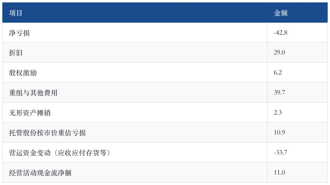 这张表的逻辑是:本季 42.8 亿美元净亏损里,有 39.7 亿美元重组费用是应计未付的(还没变成现金支出)、29.0 亿美元折旧是非现金的、10.9 亿美元托管股份重估也是非现金的。三项还原之后,加上 6.2 亿美元股权激励非现金项,经营层面实际产生的现金是正的 11 亿美元。