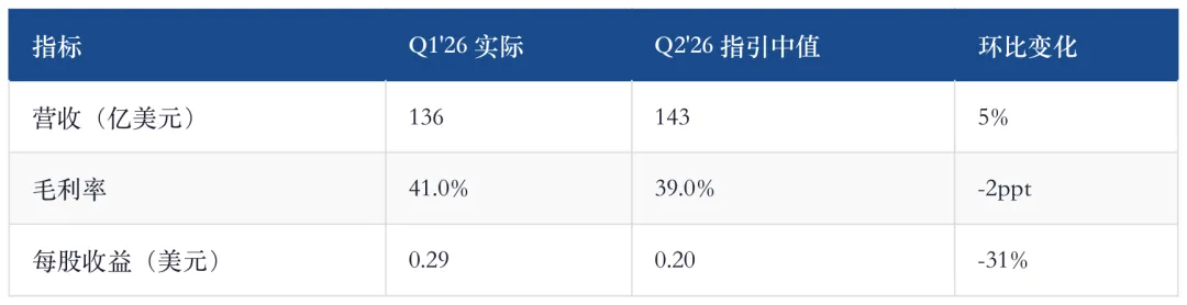 Q2 的股价催化剂: Q2 指引每股收益 0.20 美元,略低于华尔街共识约 0.15 美元的预期(彭博一致预期截至 2026-04-23),但高出幅度不大。指引真正的价值在于它告诉市场:"Q1 的 41% 毛利率不是一次性惊喜,Q2 和接下来的季度会维持在 39% 以上"。