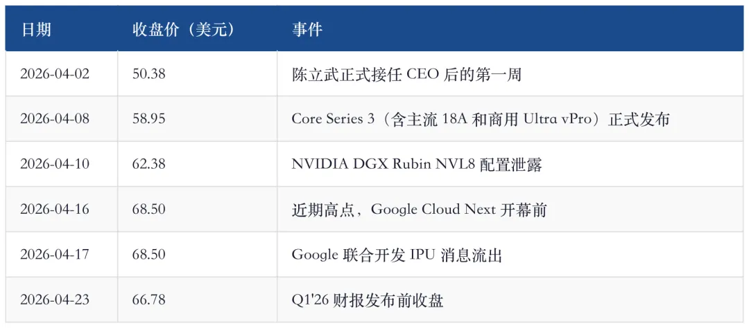 英特尔股价从 2026-04-02 收盘 50.38 美元涨到 2026-04-23 收盘 66.78 美元,21 个交易日累计涨幅 32.5%。财报发布前夜(4/23)收盘相对 4/21 的低点 66.26 美元反而小幅下跌,而 4/16 曾创下 68.50 美元的近期高点——说明市场在财报发布前已经把大部分预期反映进了股价。