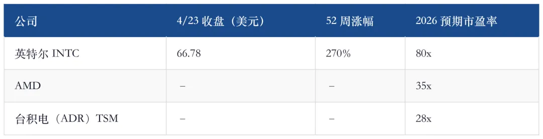 英特尔的估值溢价反映的是"预期反转速度"而不是"盈利能力"。台积电和 AMD 盈利能力稳定,估值按正常周期股估;英特尔从深度亏损到盈利兑现,估值包含极大的 beta。这意味着股价对后续每一份财报的反应会更剧烈——业绩继续兑现,估值会继续修复;业绩有任何回撤,估值会快速下杀。