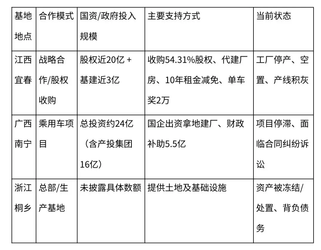 · 股权收购:为了绑定企业,宜春市国资委和财政局所属的平台公司,并未要求企业自行投入,而是直接动用财政资金,投资近20亿元收购了合众新能源控股股东持有的54.31%股权。这意味着地方政府直接成为了企业的“股东”,却失去了对项目的实质性控制权[9]。