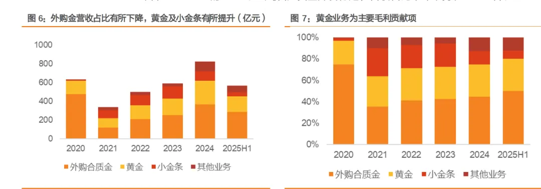 公司主营业务为黄金开采和加工。公司核心业务为自主矿山产金的开采、冶炼和销售,并有空闲冶炼产能加工外购金并销售。公司近年来外购金加工收入占比有所上升,由 2021年的35.20%逐年上升至2025H1的50.14%,小金条的收入占比有所下降,由2021年的25.84%下降至2025H1的7.65%。公司自产黄金开发稳定,营收占比常年维持在30%左右。