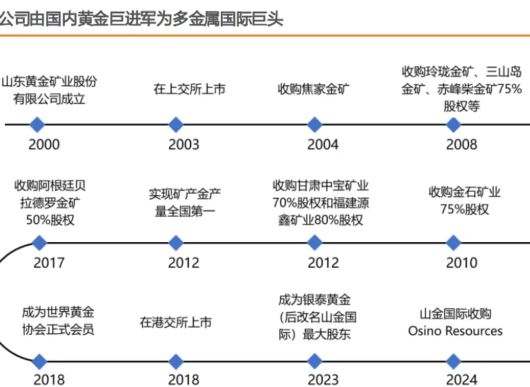 立足山东走向世界,全球布局黄金资源。山东黄金于2003年在上交所上市后进入快速扩张期,在国内逐步扩张战略版图。于2004年收购焦家金矿,2008年收购玲珑金矿、三山岛金矿、赤峰柴金矿等,2010年收购金石矿业,2012年收购甘肃中宝矿业和福建源鑫矿业,并实现矿产金产量全国第一。2017年公司迈出走向国际的第一步,于2017年收购阿根廷贝拉德罗金矿,并于2018年成为世界黄金协会正式会员并于港交所上市。2023年,公司成为银泰黄金(后改名山金国际)最大股东,涵盖金、银、铅、锌等有色金属生产,公司正式走向多金属布局。2024年,山金国际收购OsinoResources,在纳米比亚进一步扩张资源版图
