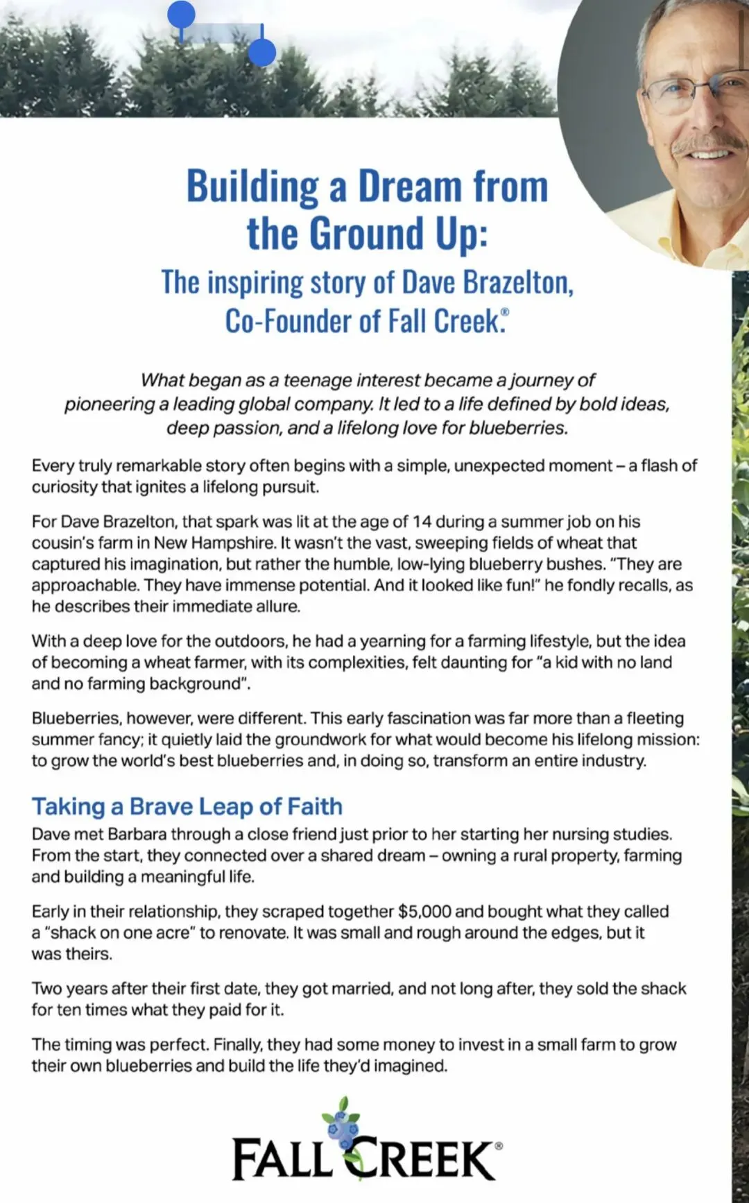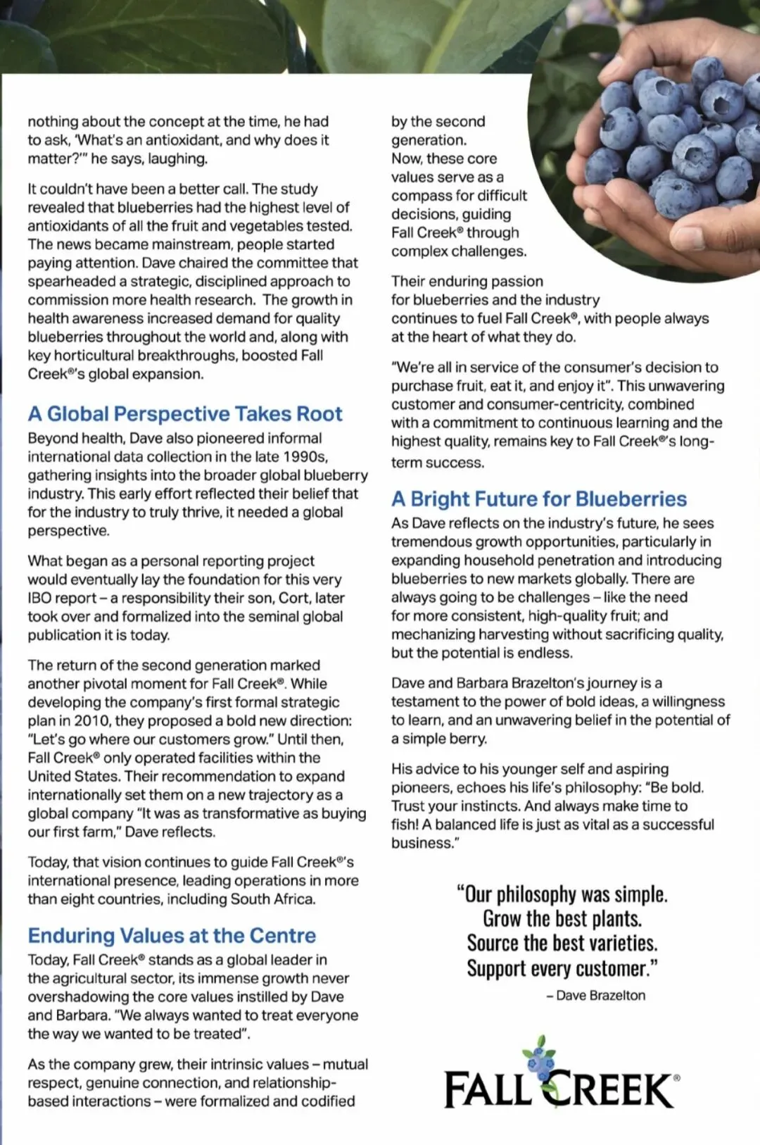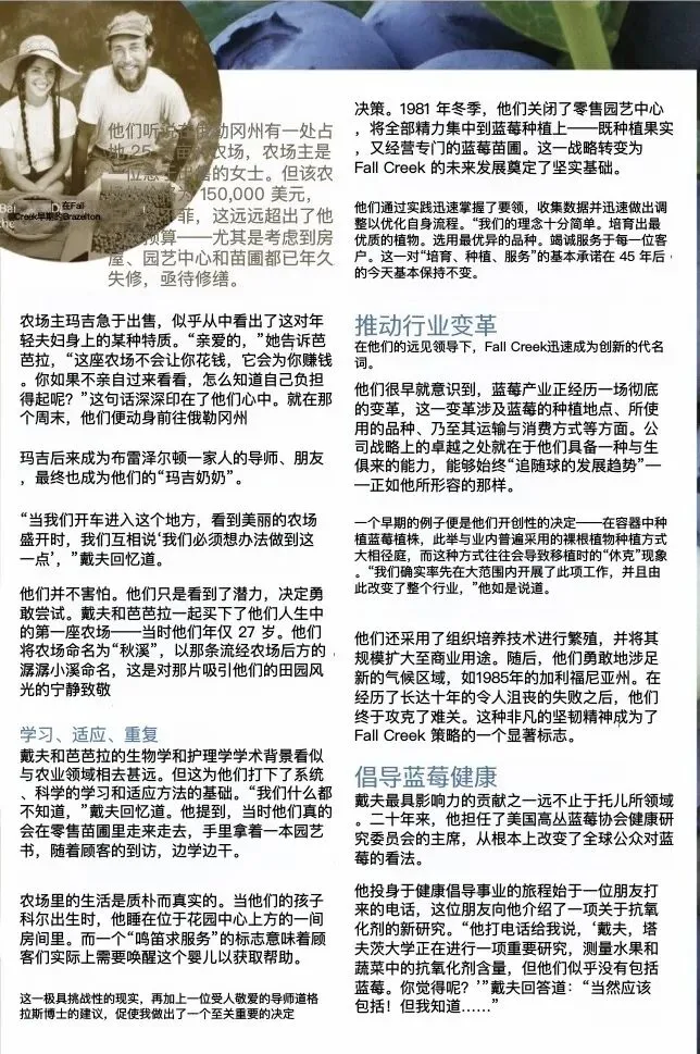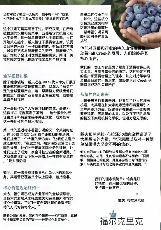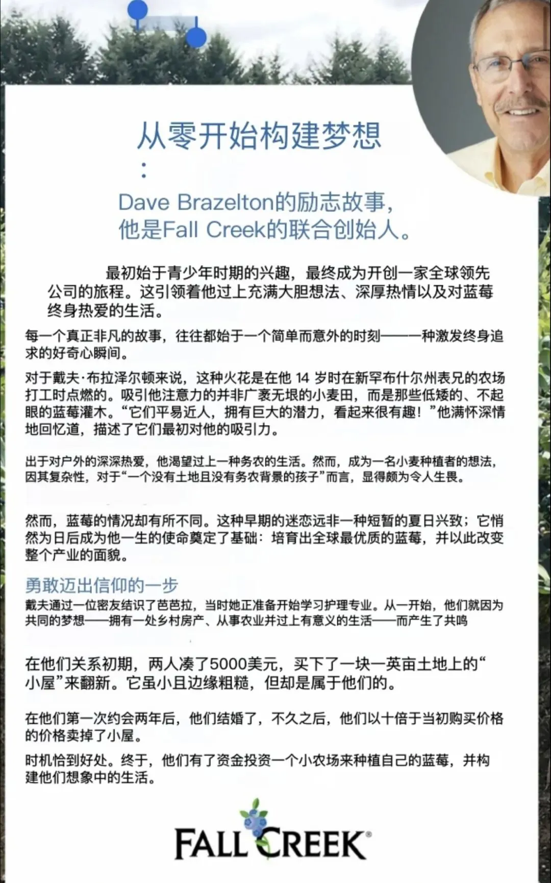 关于2025中国蓝莓产业报告的内容放在下一篇。让我感兴趣的是开头介绍Fallcreek创始人的故事,让人觉得鲜活,让人觉得种蓝莓也是一件让人觉得美好,值得热爱的生活与工作。还有他们的理念(同样也是我们的理念):