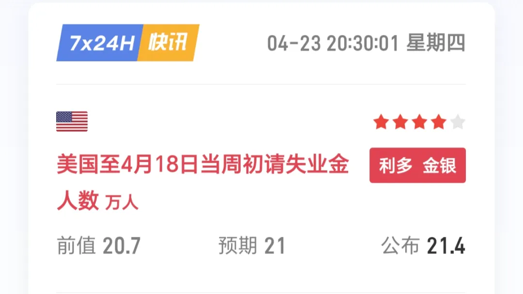 西大公布了初请失业金人数,前值20.7,预期21,公布21.4.