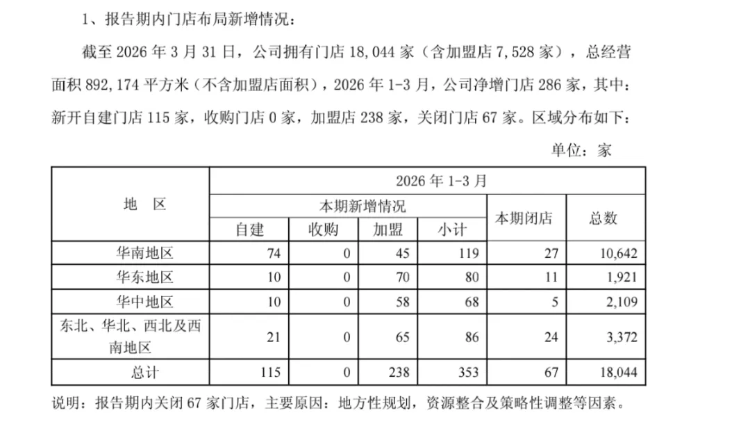 2026年一季度末一共有15001家门店,相较于2025年年底的14975家,增加了26家,三天开一家。