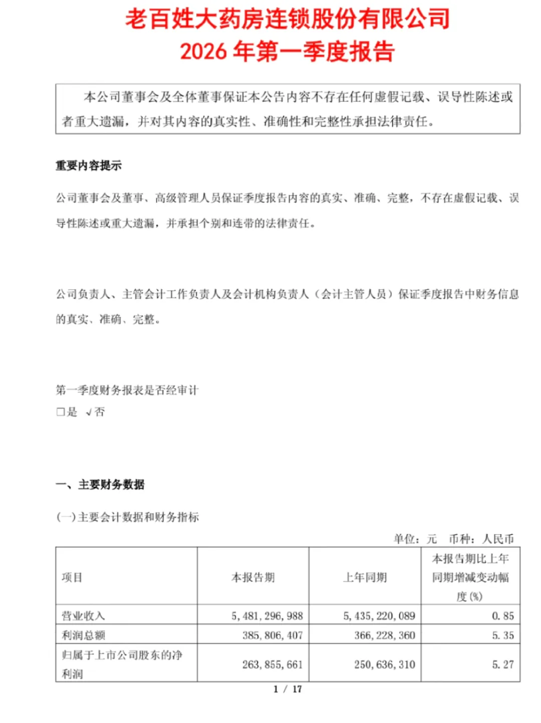 作为对比,另一家药房三傻之一的也在昨天发布了2026一季报: