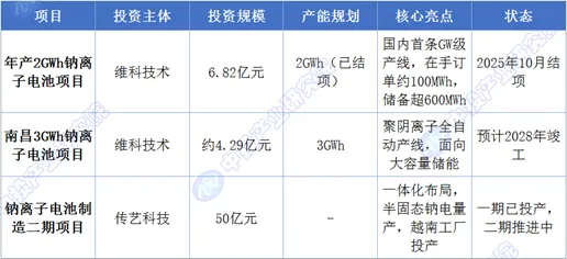 在维科技术完成2GWh项目的基础上,公司于2025年6月进一步推进产能扩张,其南昌钠离子电池项目获得备案通过,总投资约4.29亿元,主要产品为200Ah及以上容量的钠离子电池,采用聚阴离子全自动产线,建成后可达年产3GWh的规模,预计2028年6月竣工。