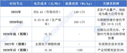 从成本演进趋势来看,预计2028年后,随着产业规模突破百GWh,电芯成本可降至0.30元/Wh以下,能量密度提升至180Wh/kg以上,性价比优势进一步凸显。