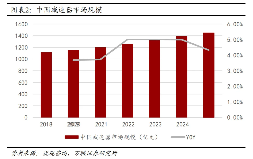 中国减速器市场规模稳步提升,市场增速维持在5%左右。根据锐观咨询,2024年我国减速器市场规模达1,447亿元,近年来维持在5%左右的增速。随着中国劳动力数量减少及人口老龄化程度加深,制造业企业为了减少人力成本并提高生产效率,正在加速向自动化生产转型,推动了减速器等工业自动化核心部件的需求增长。与此同时,国内减速器制造商通过对国外先进技术的引进、消化、吸收以及再创新,不断提高国产减速器的市场竞争力,推动了减速器产品的国产化替代,对外国技术的依赖程度逐渐降低。