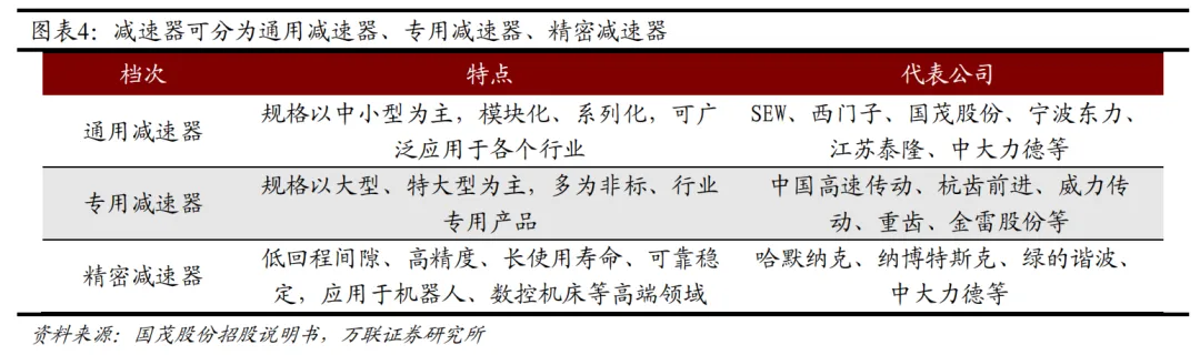 · 通用减速器:一般传动减速器,以中小型规格为主,广泛应用于多个行业领域,如工业齿轮箱和输送机械等。其控制精度较低,可满足大多数机械设备在基本动力传动方面的需求,主营通用减速器的代表企业包括SEW、西门子、国茂股份、宁波东力、江苏泰隆、中大力德等。