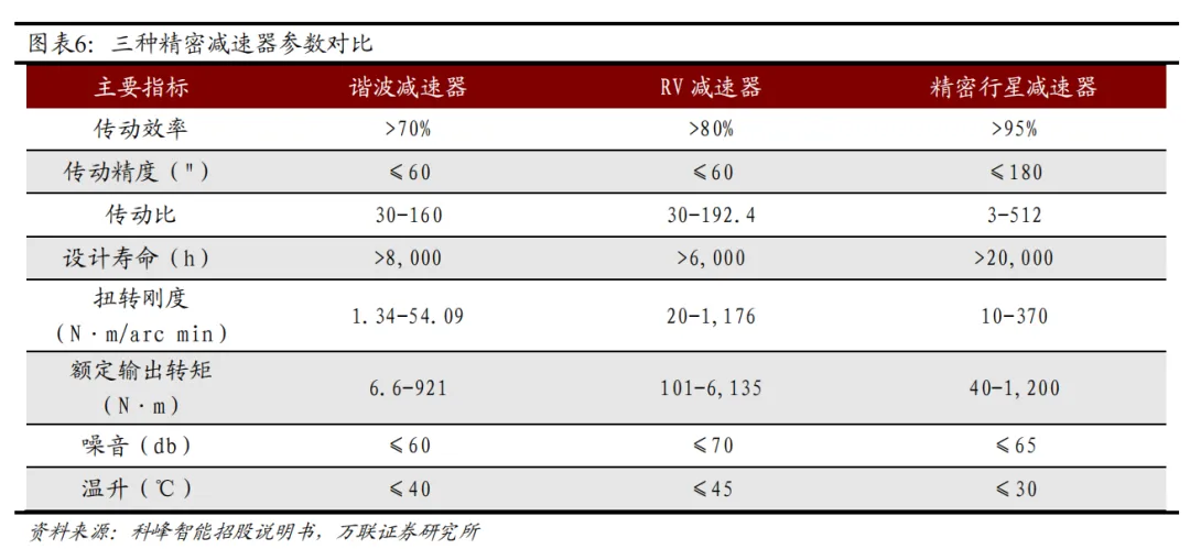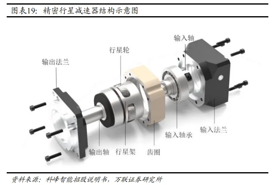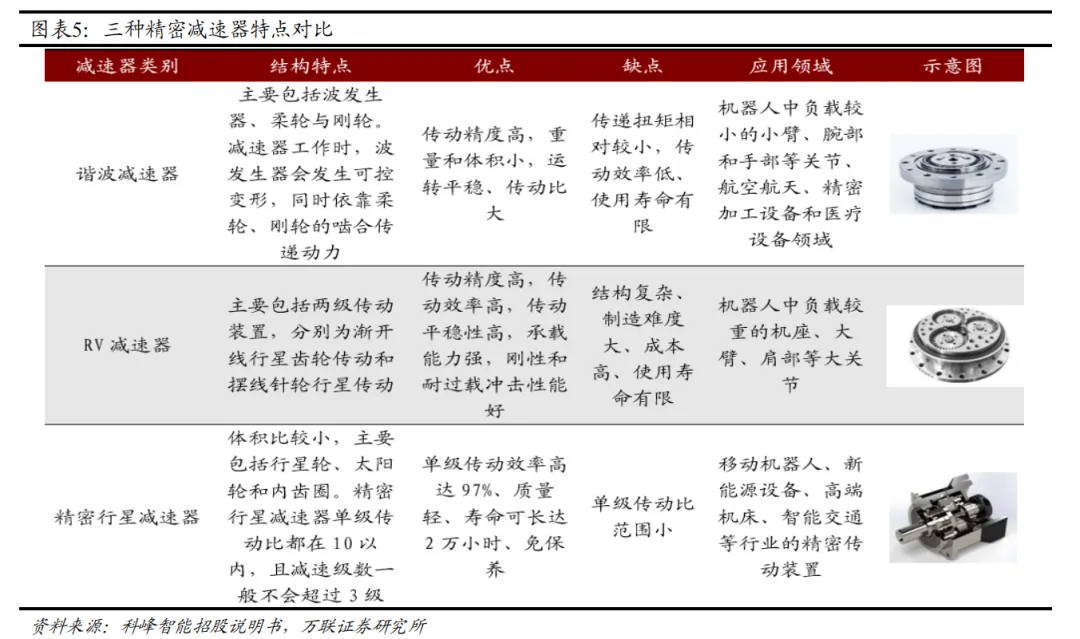 ③精密行星减速器:精密行星减速器体积较小,主要包括行星轮、太阳轮和内齿圈,其结构紧凑,具备扭矩大、单级传动效率高、质量轻、寿命长、免保养等优点,常被用于机器人中对精度要求低的部分身体旋转关节。其缺点主要在于单级传动比范围小。