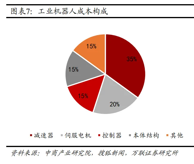 精密减速器是机器人的重要零部件,在工业机器人和人形机器人中的成本占比均较高。减速器的性能直接影响机器人的性能,由于其在机器人中的重要作用,质量和性能仍然是选择的首要关注点。减速器成本在机器人总成本中占有较大比重,根据中商产业研究院数据,减速器在工业机器人成本中占比35%,是成本占比最高的零部件。根据智研咨询数据,减速器在人形机器人成本中的占比为16%,仅次于无框力矩电机,也是人形机器人的重要零部件。随着技术进步与市场竞争加剧,减速器的价格正在逐步降低,但其仍是机器人成本的关键构成部分。全球减速器制造商正致力于经由技术革新及规模化生产,实现减速器成本的进一步降低。