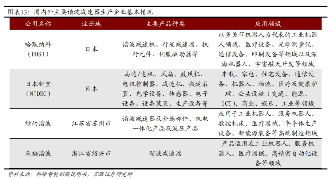 · 精密减速器:具备低回程间隙、高精度、长使用寿命、可靠稳定、适应性强等特点,是机器人以及高端机床等对精度有严格要求领域的理想选择。主营精密减速器的代表企业包括哈默纳克、纳博特斯克、绿的谐波、中大力德等。