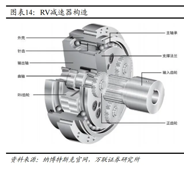 ②RV减速器:RV减速器由渐开线行星齿轮传动和摆线针轮行星传动两级传动机构组成,因其传动效率与传动平稳性高、承载能力强、刚性和耐过载冲击性能良好及传动精度高等特性,通常适用于工业机器人基座、大臂、肩部等重负载的位置。其缺点主要在于结构复杂、制造难度大、成本高。