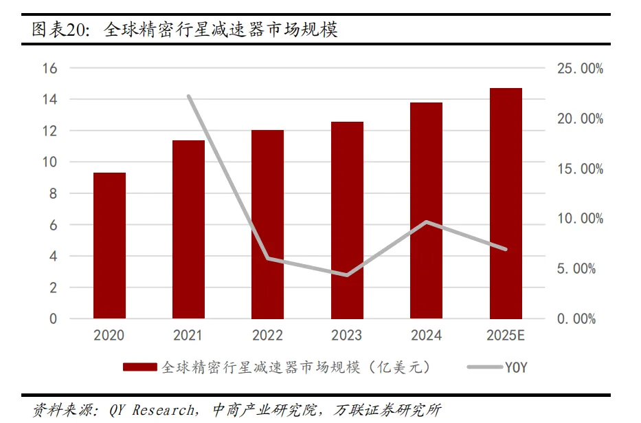 全球精密行星减速器市场规模稳步增长,国内精密行星减速器市场规模有望进一步扩大。受到工业自动化、机器人技术、航空航天和其他精密制造领域需求的推动,精密行星减速器市场规模近年来呈现稳定增长的趋势。根据QYResearch数据,2020-2024年全球精密行星减速器市场规模将由9.29亿美元增长至13.76亿美元,CAGR为10.32%;预计2025年全球精密行星减速器市场规模将达到14.71亿美元。