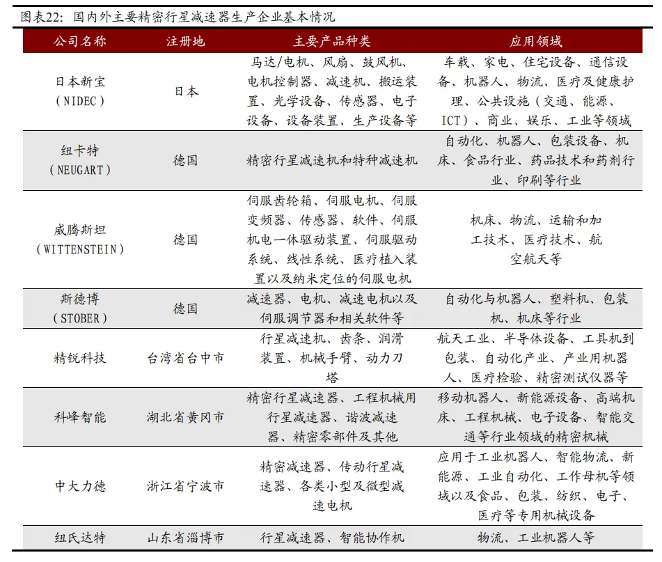 国产精密行星减速器替代空间大。在全球范围内,德国、日本等国家的精密行星减速器产品以高性能和高质量著称,其产品在材料、设计水平、质量控制、精度、可靠性和使用寿命等方面处于行业领先地位,广泛应用于自动化设备、机器人、精密机床等高端领域,主要厂家为日本新宝、纽卡特、威腾斯坦等。国产厂家以科峰智能、纽氏达特为主要代表。