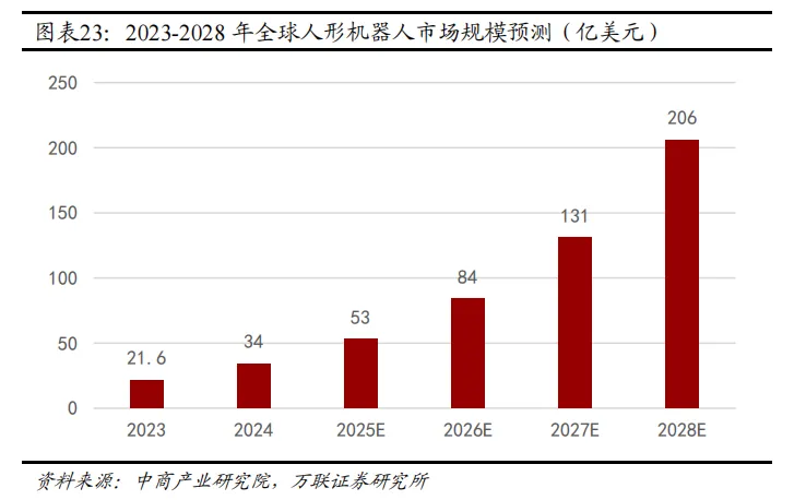 人形机器人发展空间广阔,预计市场规模将高速增长。人形机器人未来市场潜力大,随着技术进步、成本降低以及社会需求的增加,其在工业生产、家庭服务、养老护理、医疗辅助、教育娱乐等多个领域都有望实现广泛应用,未来人形机器人在提供辅助服务、提高生活质量方面的作用将变得更加重要。根据中商产业研究院,预计2028年全球人形机器人市场规模超200亿美元,2023-2028年全球人形机器人市场规模CAGR高达56.99%。未来随着人形机器人产品智能化程度不断提升,远期市场空间更为广阔。