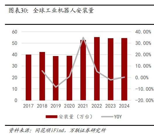 下游工业机器人市场的应用需求稳步增长,带动上游谐波减速器与RV减速器需求提升。近年来,全球工业机器人市场在安装量、技术创新、应用拓展以及市场预测方面均展现出积极的发展态势。根据IFR数据,2024年全球工业机器人安装量为54.2万台,2017-2024年CAGR为4.44%,其中2021年受新能源汽车、消费电子产业快速增长的影响,工业机器人安装量增速较高。2024年全球工业机器人安装量TOP5分别为中国、日本、美国、韩国、德国,中国作为全球最大的工业机器人市场,对全球机器人产业的推动作用显著。随着高端制造的持续推进,机器换人将从中受益,预计未来几年减速器市场增长的确定性将进一步增强。