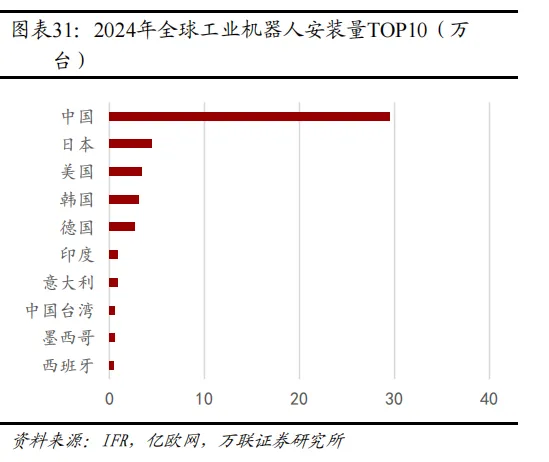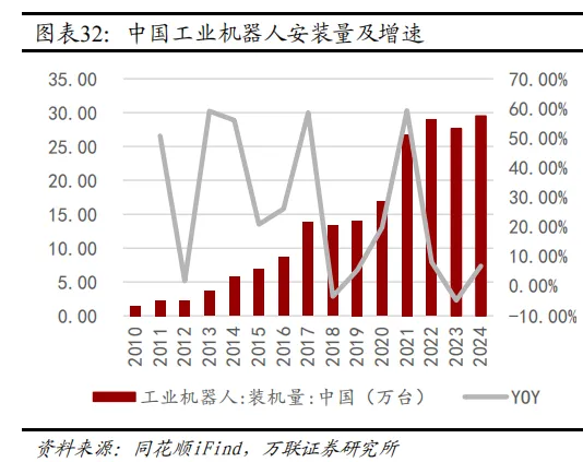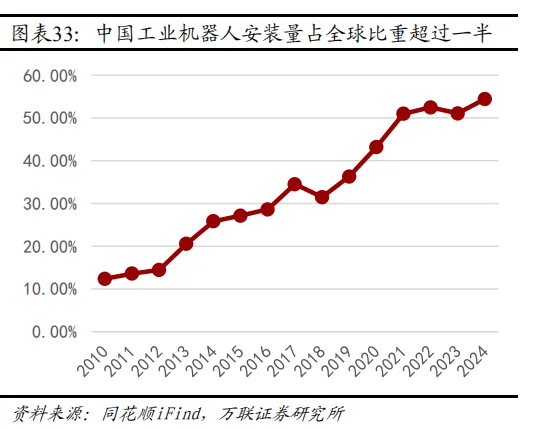 中国是全球最大的工业机器人市场,助力实现国产替代。汽车行业和电子行业是工业机器人的主要客户,中国不仅是世界最大的汽车市场和生产基地,而且在电子设备、电池、半导体和微芯片等主要生产领域占据重要地位,助力中国成为全球最大的工业机器人市场。在产业支持政策持续出台和市场需求不断增长等多重因素的驱动下,中国工业机器人的安装量在全球范围内占据了重要地位。根据IFR统计数据,中国工业机器人安装量从2010年的1.5万台增长至2024年的29.5万台,2010-2024年CAGR为23.71%,中国工业机器人安装量占比也从2010年的12.4%增长至2023年的54.43%。中国工业机器人年安装量已经超过其他所有国家总和,已经成为全球工业机器人最大市场,加速减速器国产替代进程。