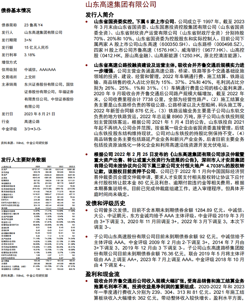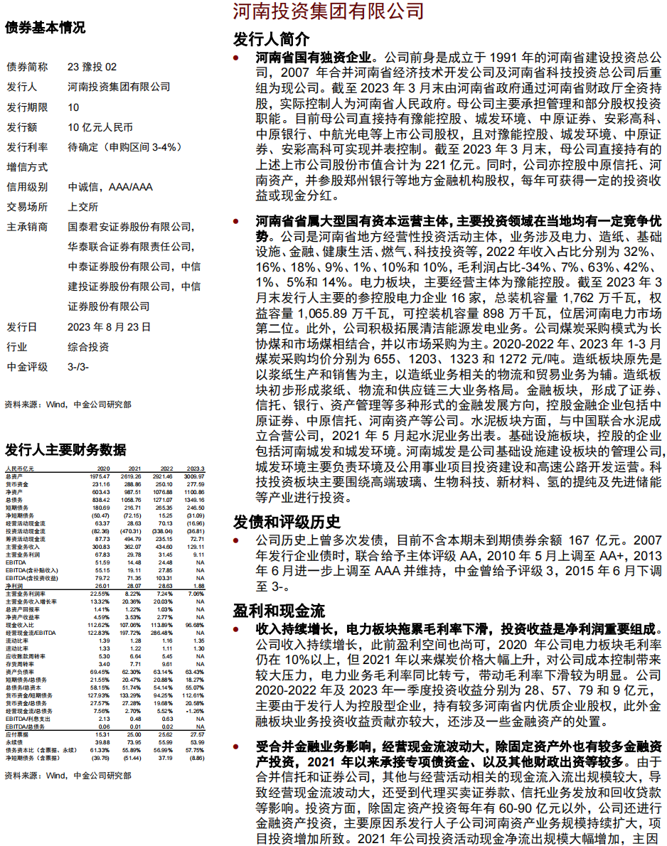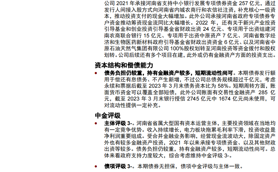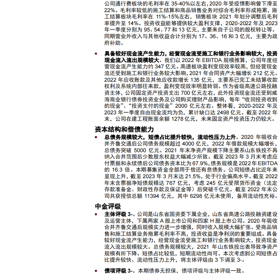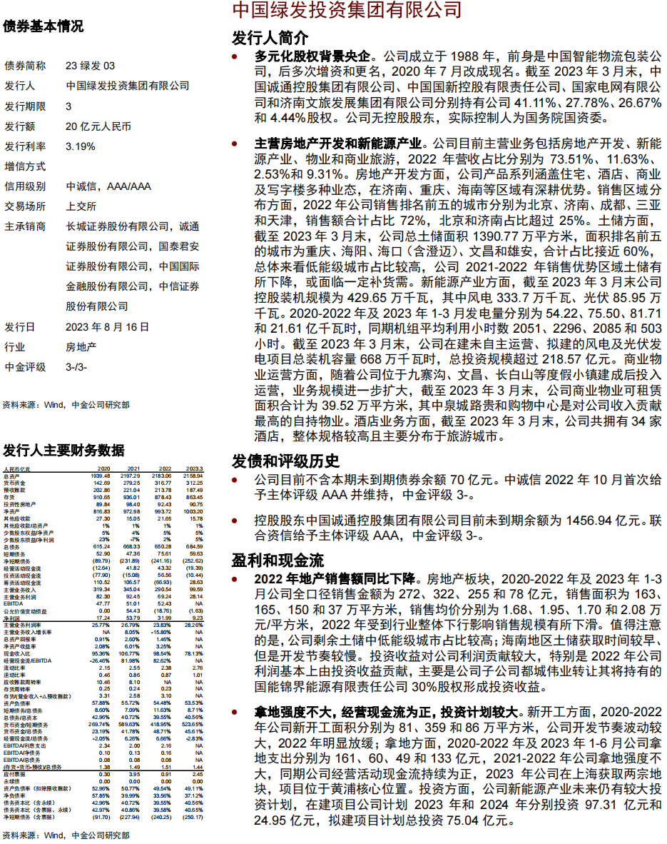 产业债发行人中,投资级主体鲁高为山东省国资委实控,下属6家上市公司,是山东省高速公路投融资建设及运营主体,吸收合并齐鲁交通后规模实力进一步增强;吸收合并齐鲁交通后公司收入规模大幅扩张,受商品销售和施工结算业务拖累毛利率不高,投资收益是净利润的重要组成;具备较好现金流产生能力,经营现金流受施工和银行业务影响较大,投资现金流入流出规模较大;总债务规模较大,短期流动性尚可,中金评级3-。绿发为多元化股权背景央企,主营房地产开发和新能源产业;2022年地产销售额同比下降;拿地强度不大,经营现金流为正,投资计划较大;债务负担较轻,流动性压力小,中金评级3-。豫投为河南省国有独资企业,是河南省省属大型国有资本运营主体,主要投资领域在当地均有一定竞争优势;收入持续增长,电力板块拖累毛利率下滑,投资收益是净利润重要组成;受合并金融业务影响,经营现金流波动大,除固定资产外也有较多金融资产投资,2021年以来承接专项债资金、以及其他财政出资等较多;债务负担仍较重,持有金融资产较多,短期流动性尚可,中金评级3-。